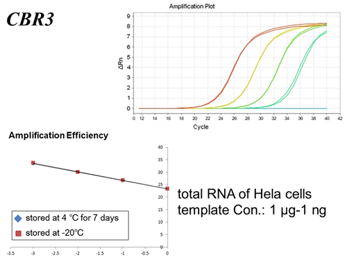 The experimental data show that compared to storage at - 20 ℃, at a temperature of 4 ℃ storage for 7 days, Biotool all in one cDNA synthesis Supermix whether amplification efficiency or sensitivity are not showed significant difference (the use of the products of reverse transcription cDNA was synthesized, and then Biotool x 2 SYBR Green qPCR master mix of qPCR assays)