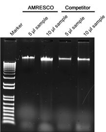 Comparison of PCR amplification using yeast genomic DNA templates. Equal volumes of genomic DNA (gDNA) purified from 5 x 107 Saccharomyces cerevisiae were used as templates in six different PCR reactions designed to produce amplicons from 718 bp to 5,290 bp in length. Results of the amplification were comparable using gDNA isolated with AMRESCO’s Yeast Genomic DNA Purification Kit and a leading competitor’s kit.